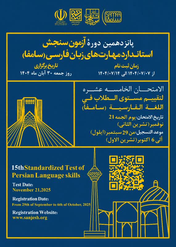 به اطلاع می رساند؛ پانزدهمین دوره آزمون سنجش استاندارد مهارت های زبان فارسی (سامفا) توسط سازمان سنجش آموزش جمهوری اسلامی ایران در روز جمعه 30 آبان ماه 1404 (پوستر پیوست) برگزار خواهد شد. تاریخ ثبت نام، برگزاری آزمون و وب سایت ثبت نام آزمون یاد شده به شرح ذیل اعلام می‌گردد: